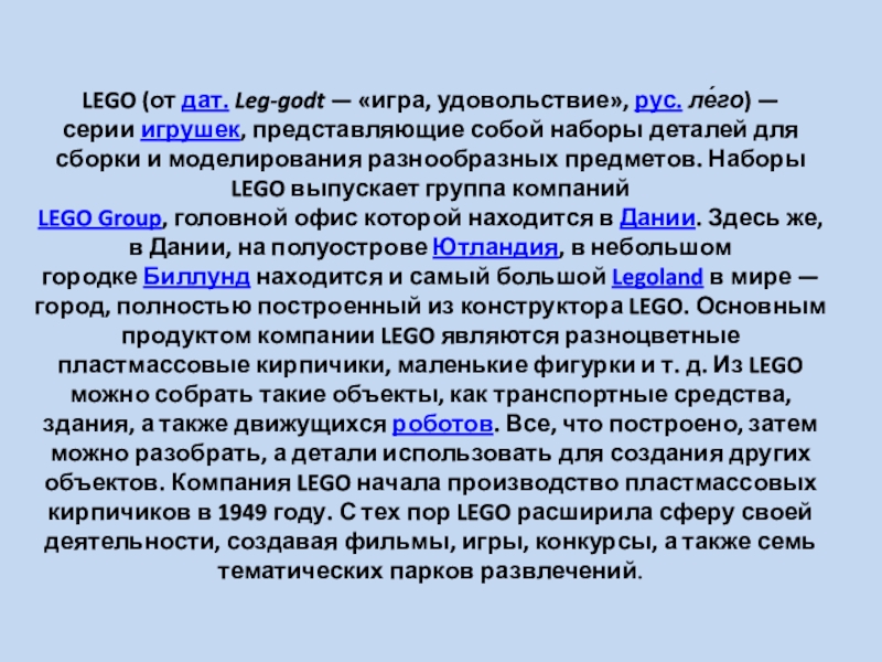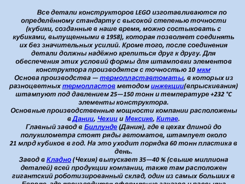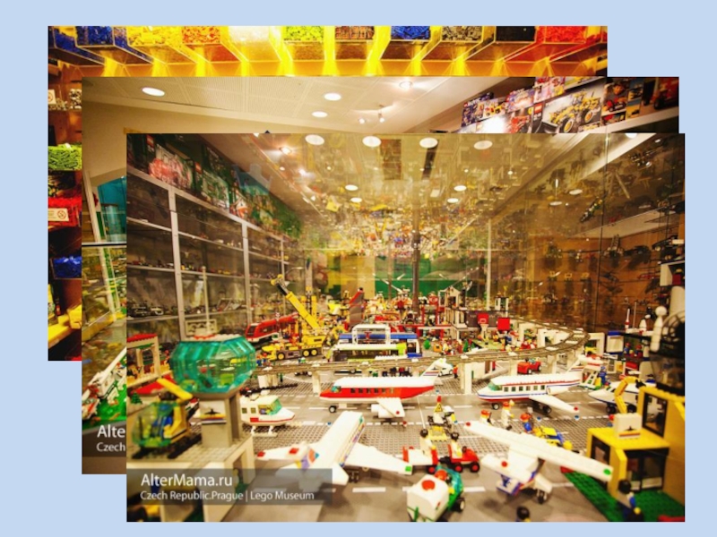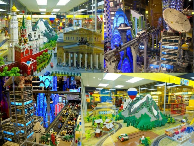 Два железнодорожных состава совершают путешествие по России – макету 7х4 метров. В этой модели России поезд проезжает через деревню, огибает горный массив, проносится мимо пристани и выезжает на Красную площадь с олокольней Ивана Великого, Спасской башней и Большим театром. Макет собран из 365,2 тысяч кубиков.