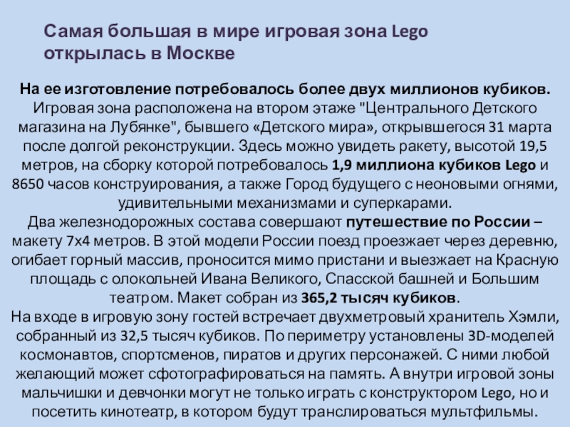 втором этаже "Центрального Детского магазина на Лубянке", бывшего «Детского мира», открывшегося 31 марта после долгой реконструкции. Здесь можно увидеть ракету, высотой 19,5 метров, на сборку которой потребовалось 1,9 миллиона кубиков Lego и 8650 часов конструирования, а также Город будущего с неоновыми огнями, удивительными механизмами и суперкарами.