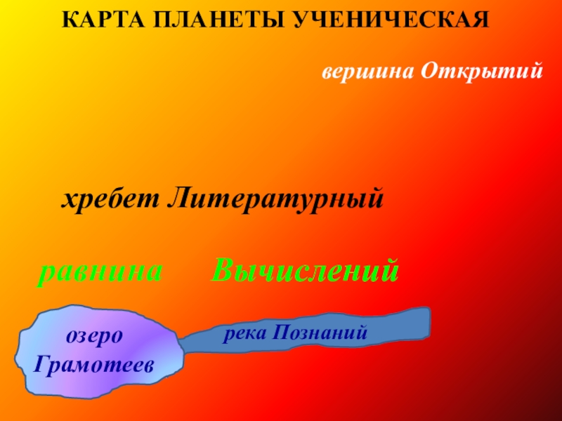 хребет Литературныйравнина Вычисленийвершина ОткрытийКАРТА ПЛАНЕТЫ УЧЕНИЧЕСКАЯрека ПознанийозероГрамотеевмореТворений