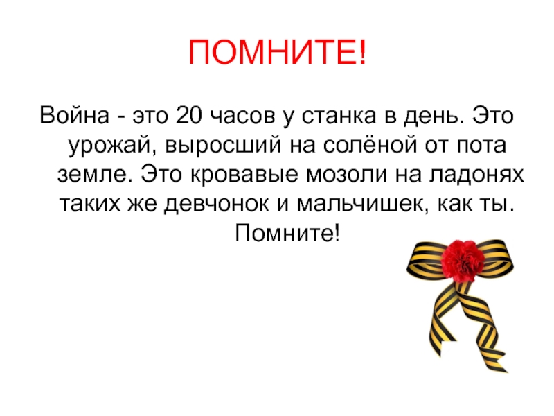 ПОМНИТЕ!Война - это 20 часов у станка в день. Это урожай, выросший на солёной от пота земле.