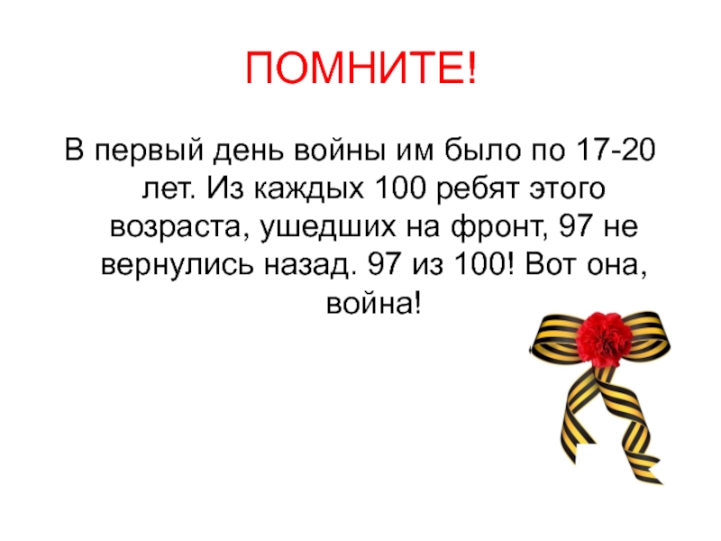 ПОМНИТЕ!В первый день войны им было по 17-20 лет. Из каждых 100 ребят этого возраста, ушедших на фронт, 97 не вернулись назад. 97 из 100! Вот она, война!