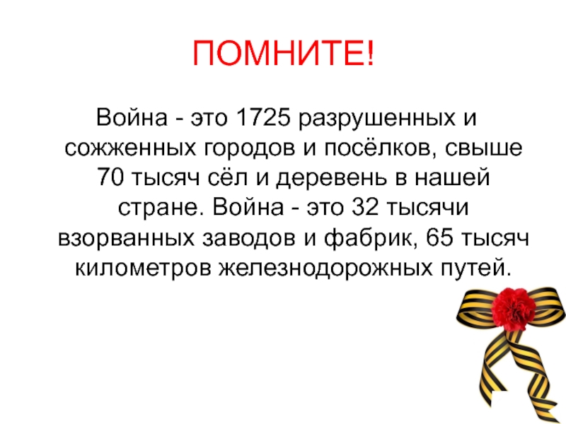 ПОМНИТЕ! Война - это 1725 разрушенных и сожженных городов и посёлков, свыше 70 тысяч сёл и деревень