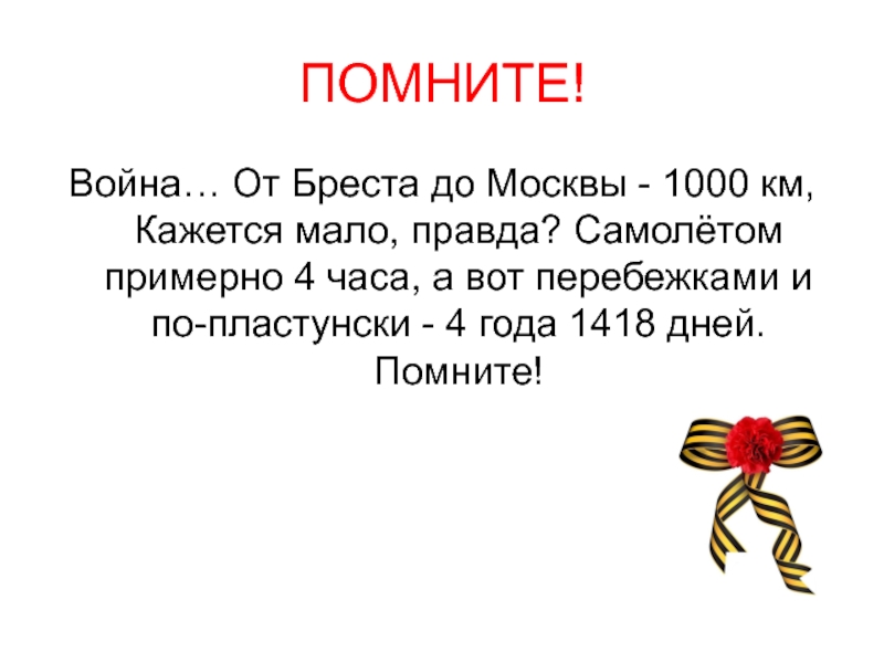 ПОМНИТЕ!Война… От Бреста до Москвы - 1000 км, Кажется мало, правда? Самолётом примерно 4 часа, а вот
