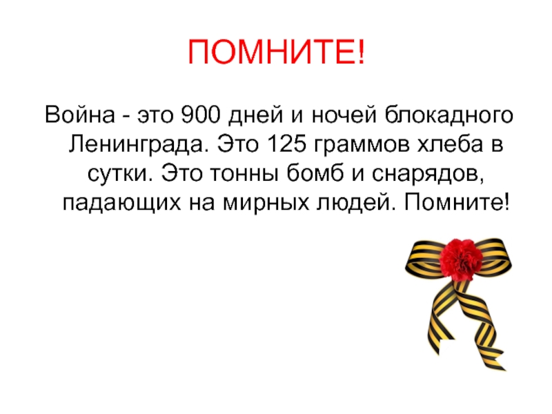 ПОМНИТЕ! Война - это 900 дней и ночей блокадного Ленинграда. Это 125 граммов хлеба в сутки. Это