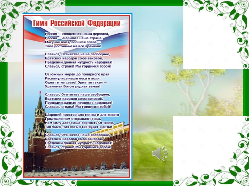 тобой живём, И берёзки, вдоль которых Рядом с мамой мы идём. Что мы Родиной зовём? Поле с тонким колоском, Наши праздники и песни, Тёплый вечер за окном. Что мы Родиной зовём? Всё, что в сердце бережём, И под небом синим-синим Флаг России над Кремлём.