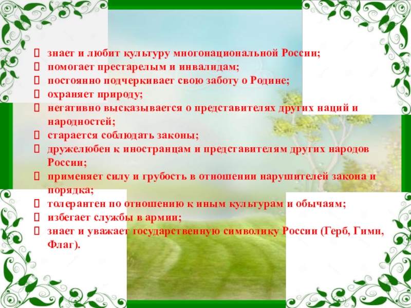знает и любит культуру многонациональной России;помогает престарелым и инвалидам;постоянно подчеркивает свою заботу о Родине;охраняет природу;негативно высказывается о