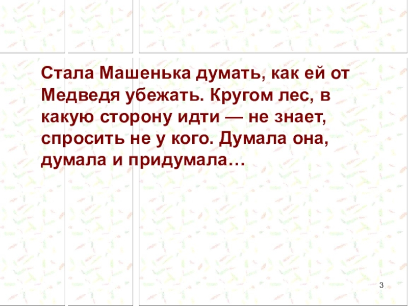 Слайд 3Стала Машенька думать, как ей от Медведя убежать. Кругом лес, в
