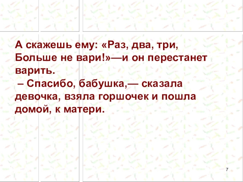 – Спасибо, бабушка,— сказала девочка, взяла горшочек и пошла домой, к матери.
