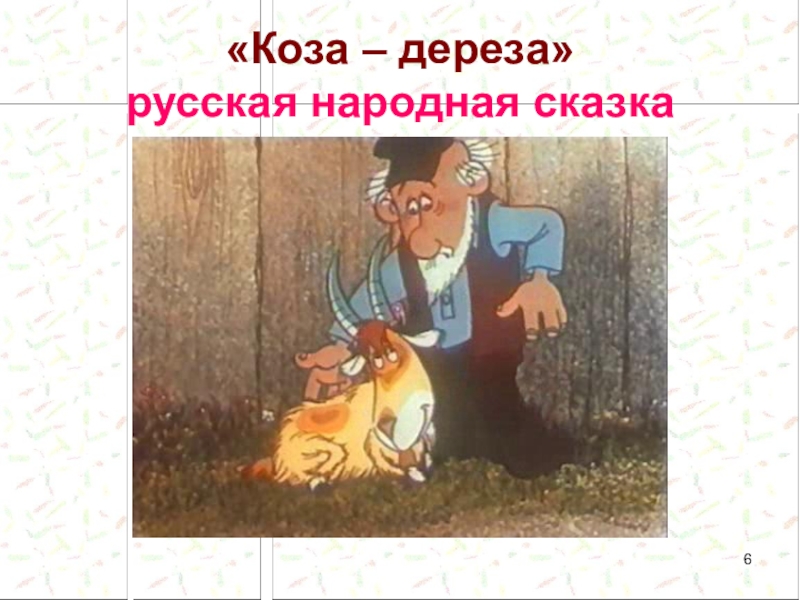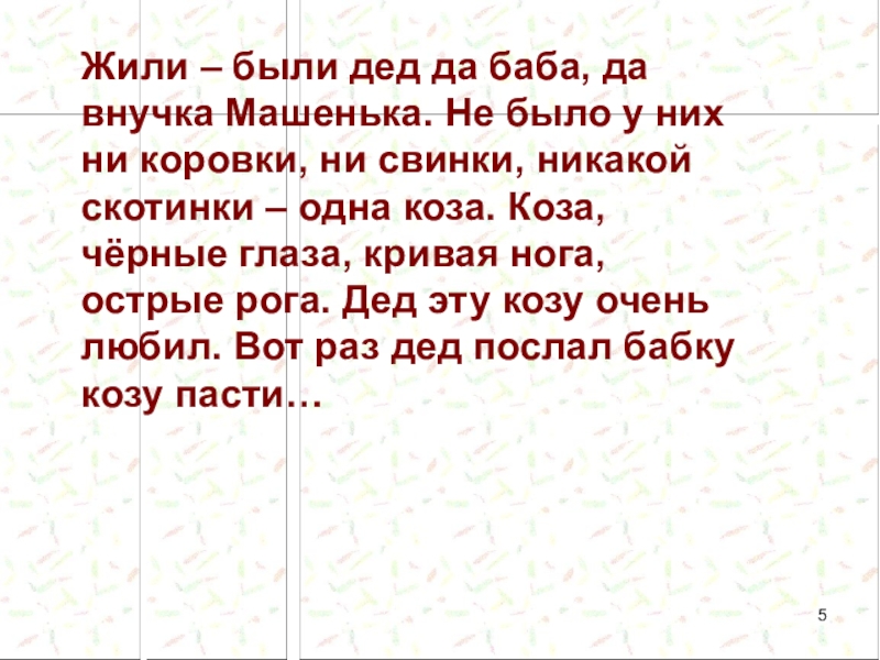 у них ни коровки, ни свинки, никакой скотинки – одна коза. Коза, чёрные глаза, кривая нога, острые рога. Дед эту козу очень любил. Вот раз дед послал бабку козу пасти…