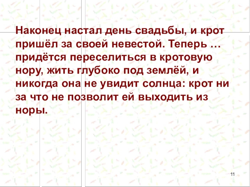 Слайд 11Наконец настал день свадьбы, и крот пришёл за своей невестой. Теперь