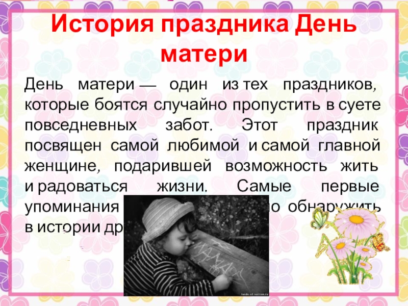 История праздника День материДень матери — один из тех праздников, которые боятся случайно пропустить в суете повседневных забот. Этот праздник посвящен самой любимой и самой главной женщине, подарившей возможность жить и радоваться жизни. Самые первые упоминания о празднике можно обнаружить в истории древнего