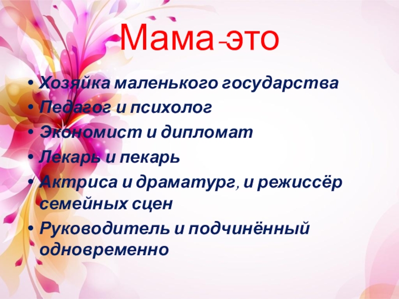 Мама-этоХозяйка маленького государстваПедагог и психологЭкономист и дипломатЛекарь и пекарьАктриса и драматург, и режиссёр семейных сценРуководитель и подчинённый