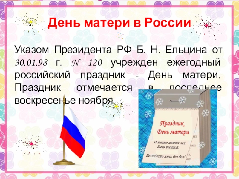 г. N 120 учрежден ежегодный российский праздник - День матери. Праздник отмечается в последнее воскресенье ноября.