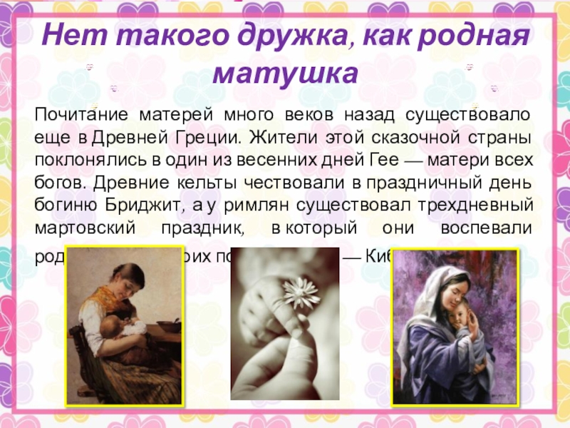 Нет такого дружка, как родная матушкаПочитание матерей много веков назад существовало еще в Древней Греции. Жители этой сказочной