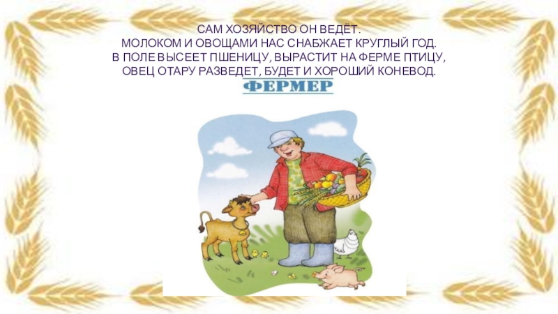Слайд 9Сам хозяйство он ведёт. Молоком и овощами Нас снабжает круглый год. В поле