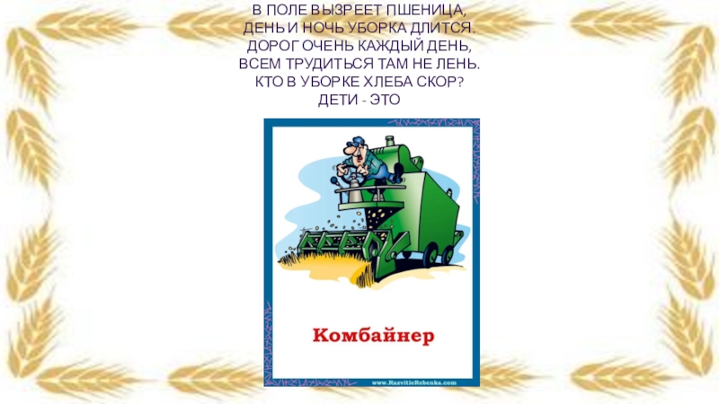 В поле вызреет пшеница, День и ночь уборка длится. Дорог очень каждый день, Всем трудиться там не