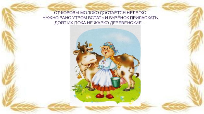 От коровы молоко Достаётся нелегко. Нужно рано утром встать И бурёнок приласкать. Доят их пока не жарко