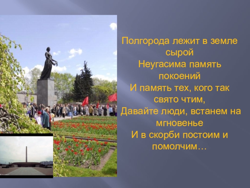Полгорода лежит в земле сыройНеугасима память покоенийИ память тех, кого так свято чтим,Давайте люди, встанем на мгновеньеИ
