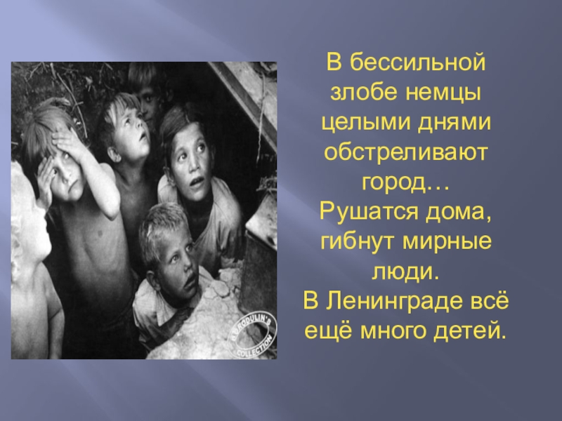 В бессильной злобе немцы целыми днями обстреливают город…Рушатся дома, гибнут мирные люди.В Ленинграде всё ещё много детей.