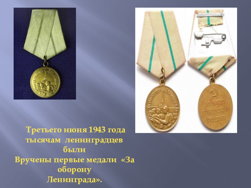 Третьего июня 1943 года тысячам ленинградцев былиВручены первые медали «За оборонуЛенинграда».