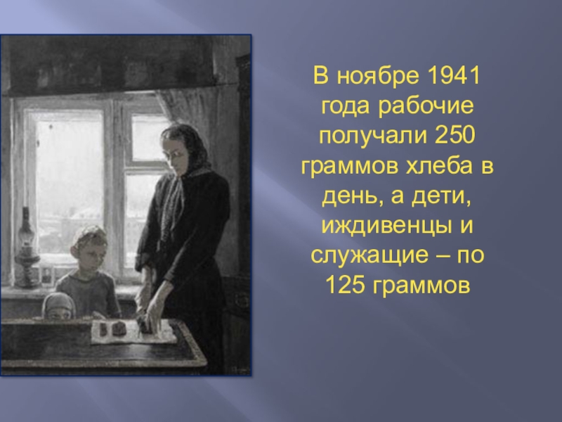 Слайд 13В ноябре 1941 года рабочие получали 250 граммов хлеба в день,