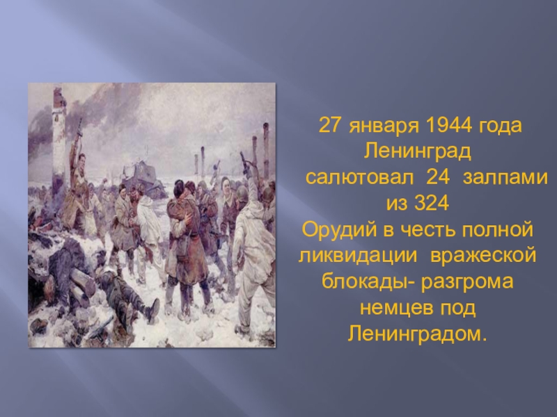 27 января 1944 года Ленинград  салютовал 24 залпами из 324Орудий в честь полной ликвидации вражеской