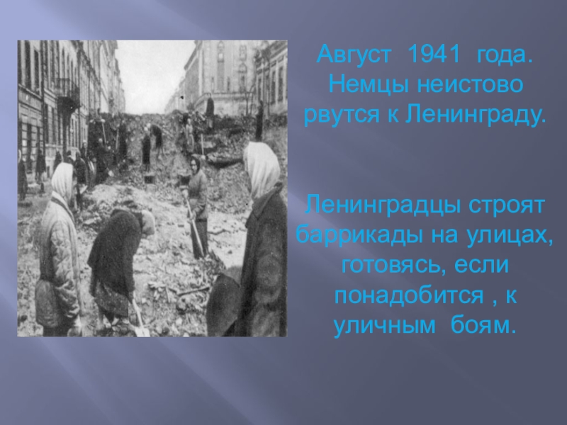 Август 1941 года. Немцы неистово рвутся к Ленинграду. Ленинградцы строят баррикады на улицах, готовясь, если понадобится ,