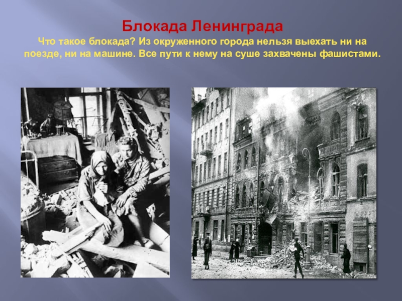 Блокада Ленинграда  Что такое блокада? Из окруженного города нельзя выехать ни на поезде, ни на машине.