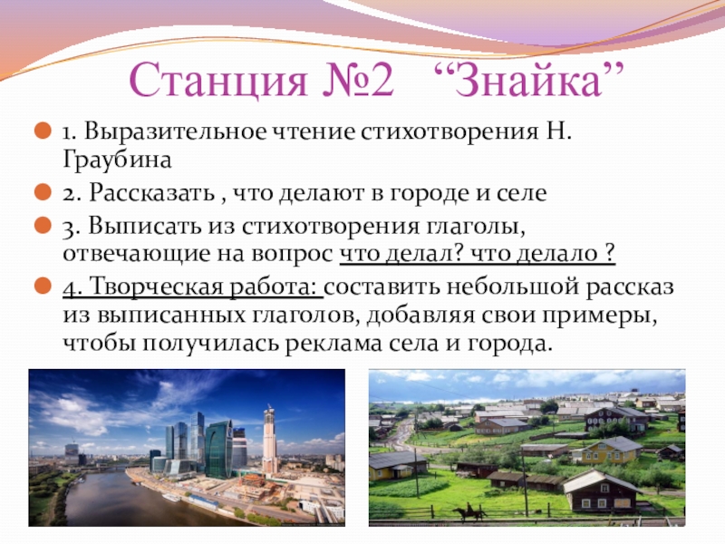 Станция №2  “Знайка”1. Выразительное чтение стихотворения Н.Граубина2. Рассказать , что делают в