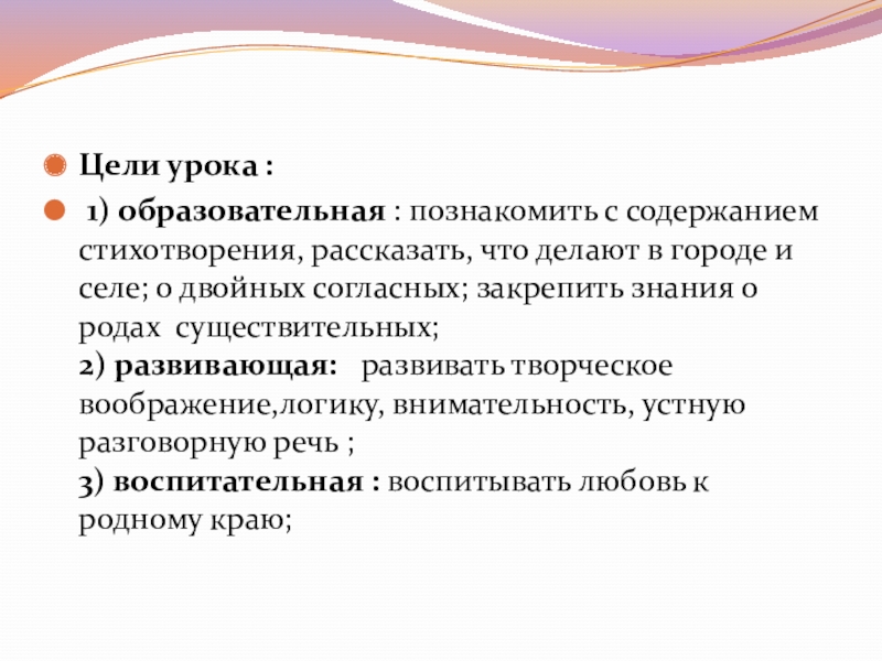Цели урока : 1) образовательная : познакомить с содержанием стихотворения, рассказать, что делают в городе и селе; о двойных согласных; закрепить знания о родах существительных;