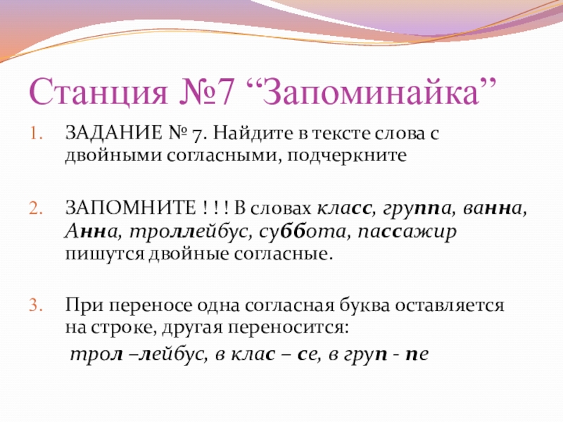 Станция №7 “Запоминайка”ЗАДАНИЕ № 7. Найдите в тексте слова с двойными согласными, подчеркнитеЗАПОМНИТЕ ! ! ! В