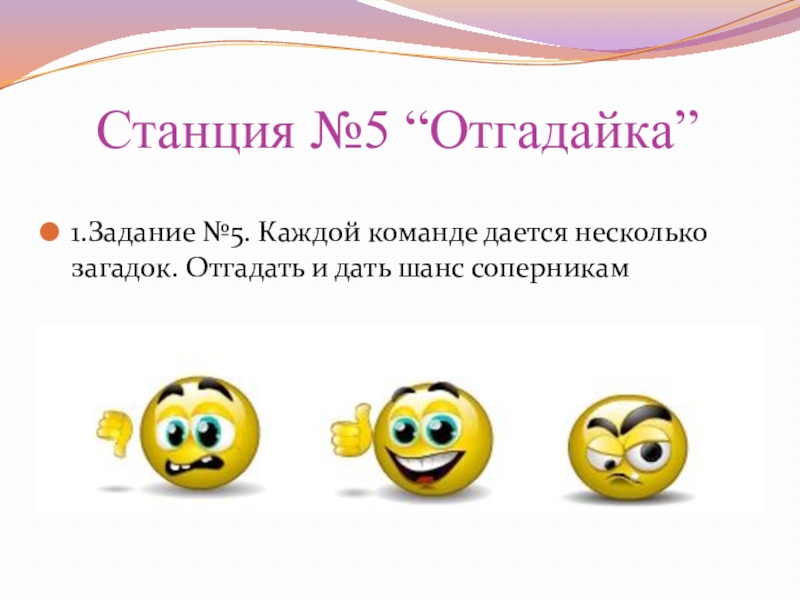 Станция №5 “Отгадайка”   1.Задание №5. Каждой команде дается несколько загадок. Отгадать и дать