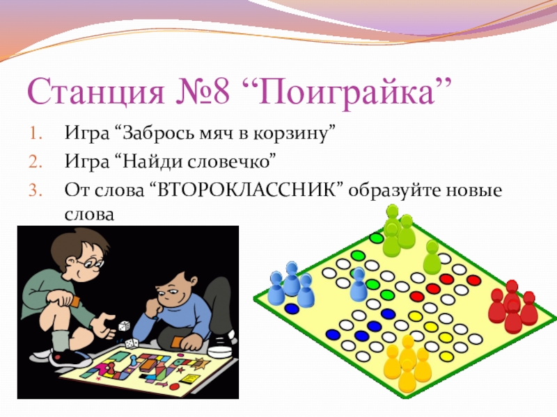 Станция №8 “Поиграйка”Игра “Забрось мяч в корзину”Игра “Найди словечко”От слова “ВТОРОКЛАССНИК” образуйте новые слова