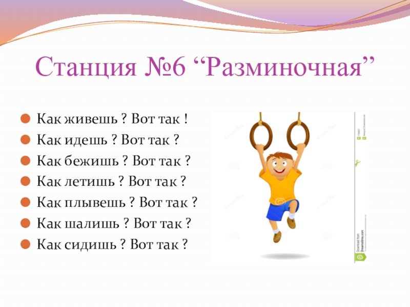 Станция №6 “Разминочная”Как живешь ? Вот так !Как идешь ? Вот так ?Как бежишь ? Вот