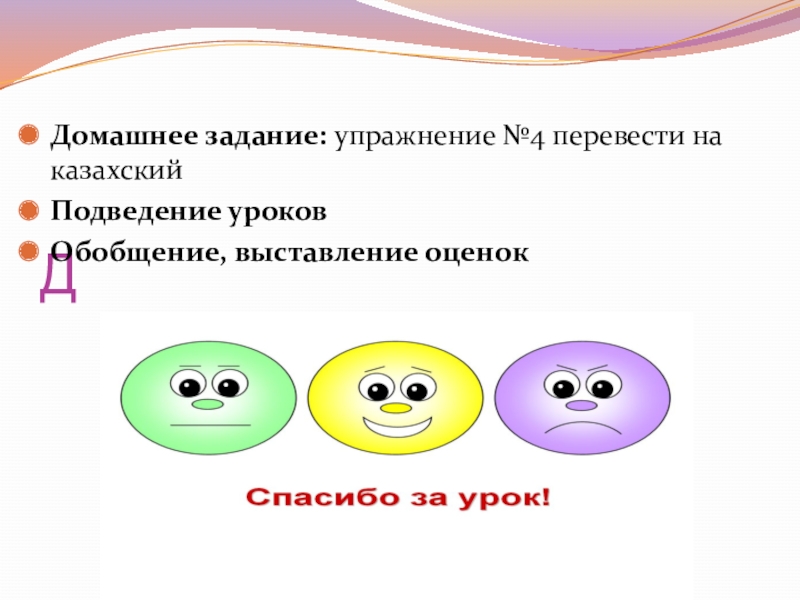 ДДомашнее задание: упражнение №4 перевести на казахскийПодведение уроковОбобщение, выставление оценок
