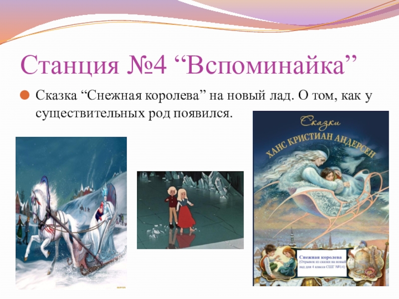 Станция №4 “Вспоминайка”Сказка “Снежная королева” на новый лад. О том, как у существительных род появился.