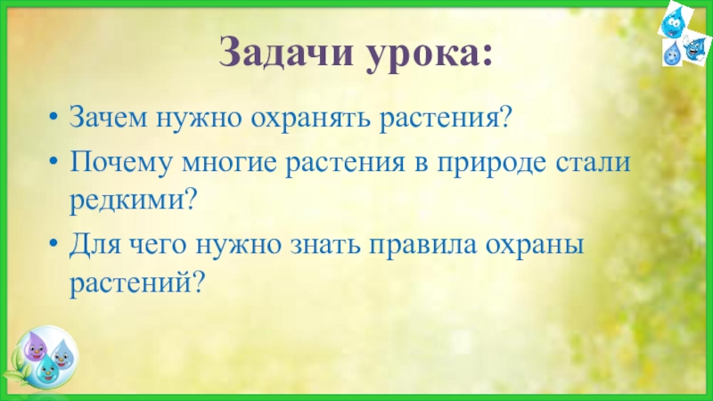 Задачи урока:Зачем нужно охранять растения?Почему многие растения в природе стали редкими?Для чего нужно знать правила охраны растений?