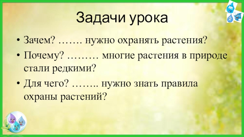 Задачи урокаЗачем? ……. нужно охранять растения?Почему? ……… многие растения в природе стали редкими?Для чего? …….. нужно знать