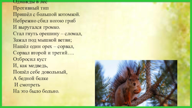 в лес Противный тип Пришёл с большой котомкой. Небрежно сбил ногою гриб И выругался громко. Стал гнуть орешину – сломал, Зажал под мышкой ветви; Нашёл один орех – сорвал, Сорвал второй и третий…. Отбросил куст И, как медведь, Пошёл себе довольный, А бедной белке И смотреть На это было больно.