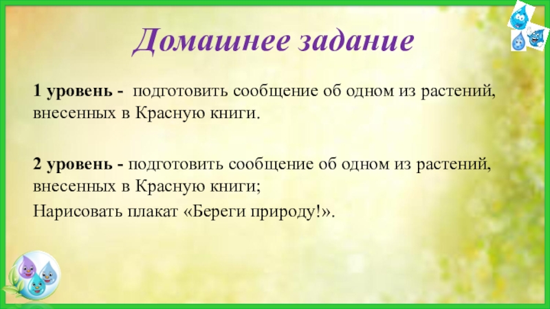 Домашнее задание1 уровень - подготовить сообщение об одном из растений, внесенных в Красную книги.2 уровень - подготовить