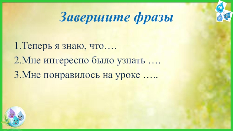 Завершите фразы1.Теперь я знаю, что….2.Мне интересно было узнать ….3.Мне понравилось на уроке …..