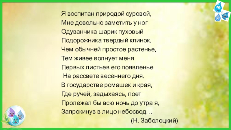 Я воспитан природой суровой,Мне довольно заметить у ногОдуванчика шарик пуховыйПодорожника твердый клинок.Чем обычней простое растенье, Тем живее