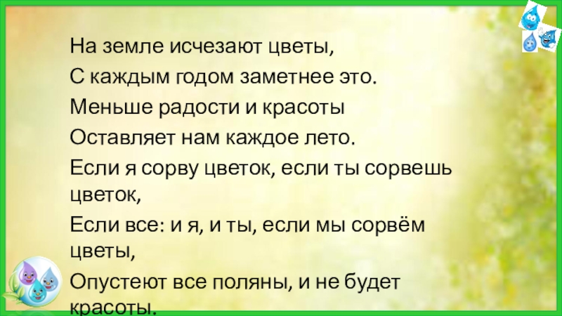 На земле исчезают цветы,С каждым годом заметнее это.Меньше радости и красотыОставляет нам каждое лето.Если я сорву цветок,