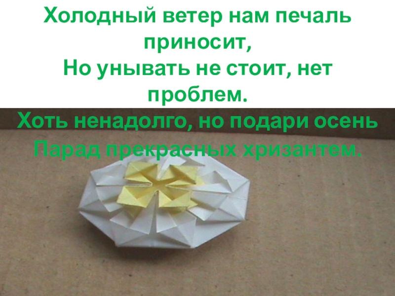 Холодный ветер нам печаль приносит,Но унывать не стоит, нет проблем.Хоть ненадолго, но подари осеньПарад прекрасных хризантем.