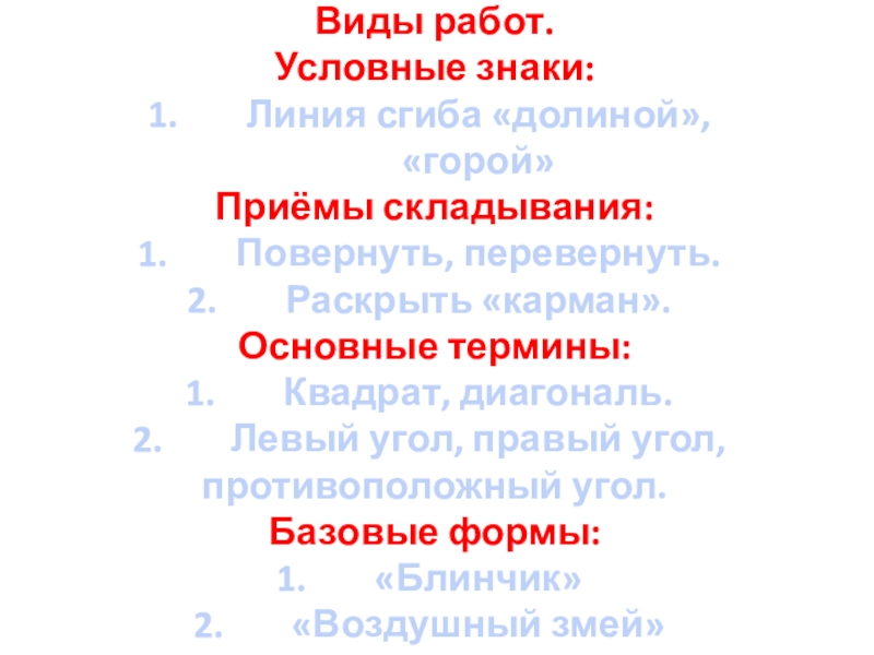 Виды работ.Условные знаки: Линия сгиба «долиной», «горой»Приёмы складывания:Повернуть, перевернуть.Раскрыть «карман».Основные термины:Квадрат, диагональ.Левый угол, правый угол,противоположный угол.Базовые формы:«Блинчик»«Воздушный