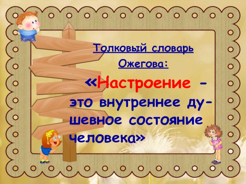 Толковый словарь Ожегова:  «Настроение - это внутреннее ду-шевное состояние человека»
