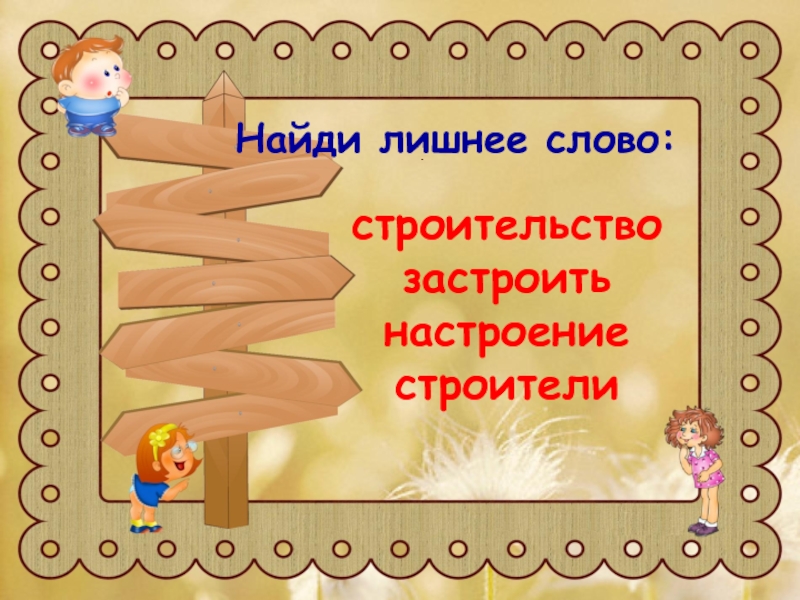 Найди лишнее слово:     Найди лишнее слово:строительствозастроитьнастроениестроители