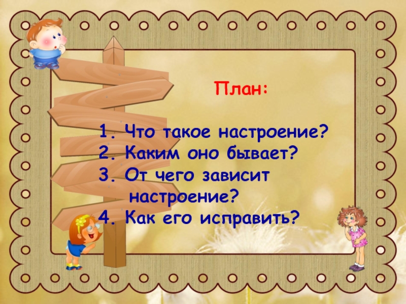 1. Что такое настроение? 2. Каким оно бывает? 3. От чего зависит