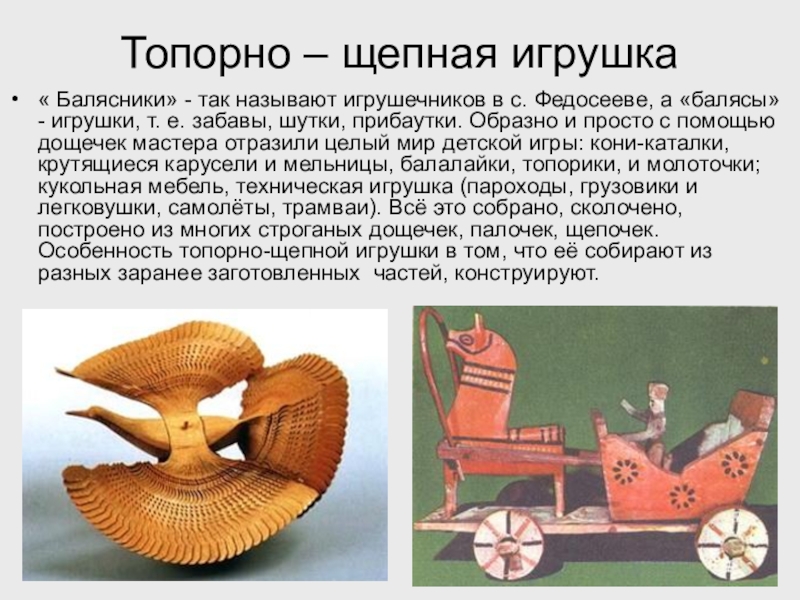 Федосееве, а «балясы» - игрушки, т. е. забавы, шутки, прибаутки. Образно и просто с помощью дощечек мастера отразили целый мир детской игры: кони-каталки, крутящиеся карусели и мельницы, балалайки, топорики, и молоточки; кукольная мебель, техническая игрушка (пароходы, грузовики и легковушки, самолёты, трамваи). Всё это собрано, сколочено, построено из многих строганых дощечек, палочек, щепочек. Особенность топорно-щепной игрушки в том, что её собирают из разных заранее заготовленных частей, конструируют.