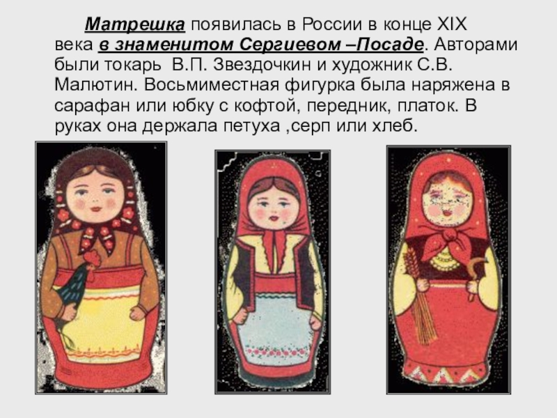 знаменитом Сергиевом –Посаде. Авторами были токарь В.П. Звездочкин и художник С.В. Малютин. Восьмиместная фигурка была наряжена в сарафан или юбку с кофтой, передник, платок. В руках она держала петуха ,серп или хлеб.